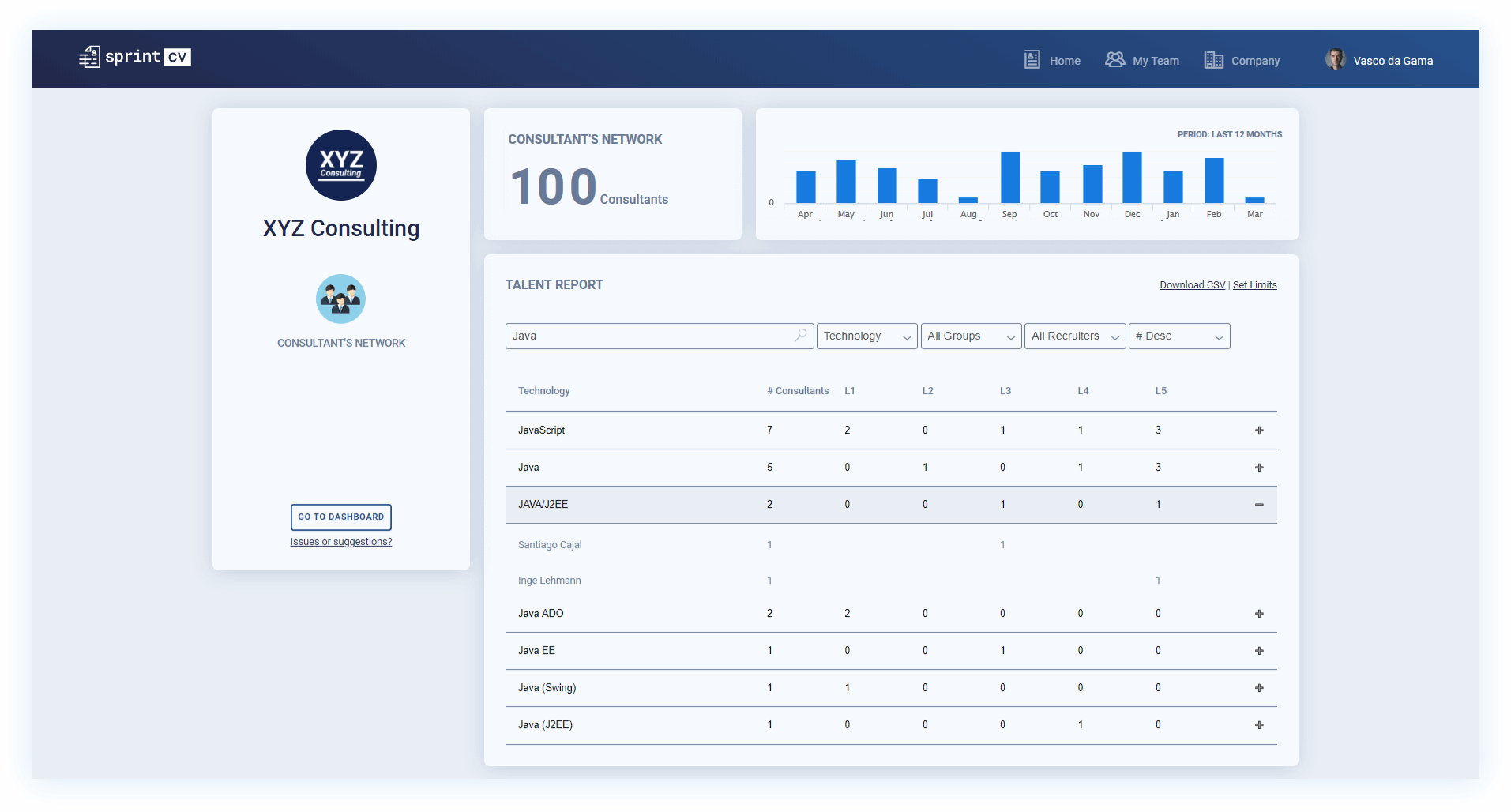 Single dashboard where the IT recruiter can access to all of their consultant’s CV, edit their business card, invite more consultants and see some key indicators of their profile.
